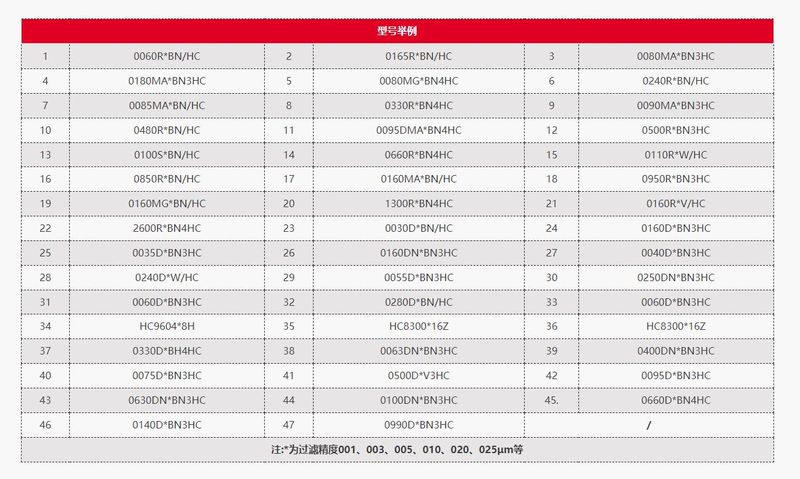 注:*為過濾精度001、003、005、010、020、025μm等